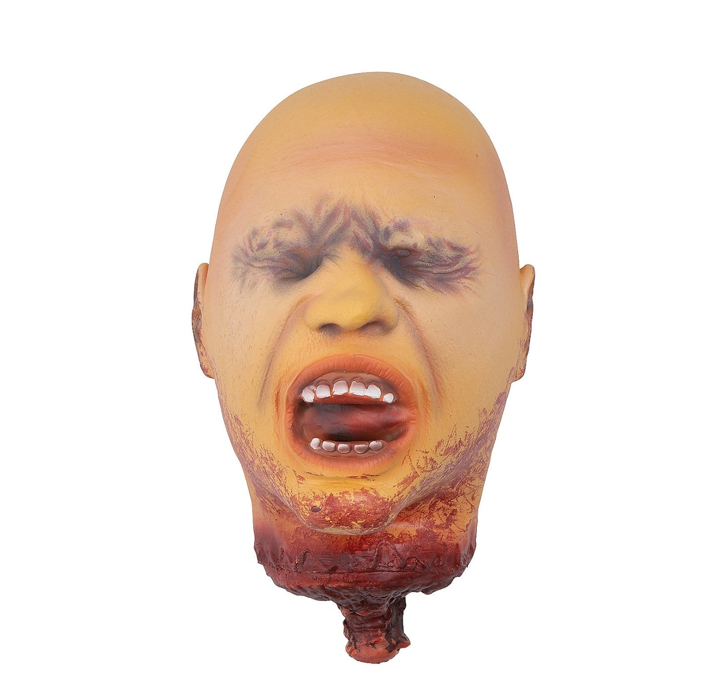 Life-size screaming look, ripped off head, jagged wound with backbone exposed. Beautifully detailed, all-latex, foam filled. Head is 13 inches tall, 7 inches wide, 9 inches front to back.