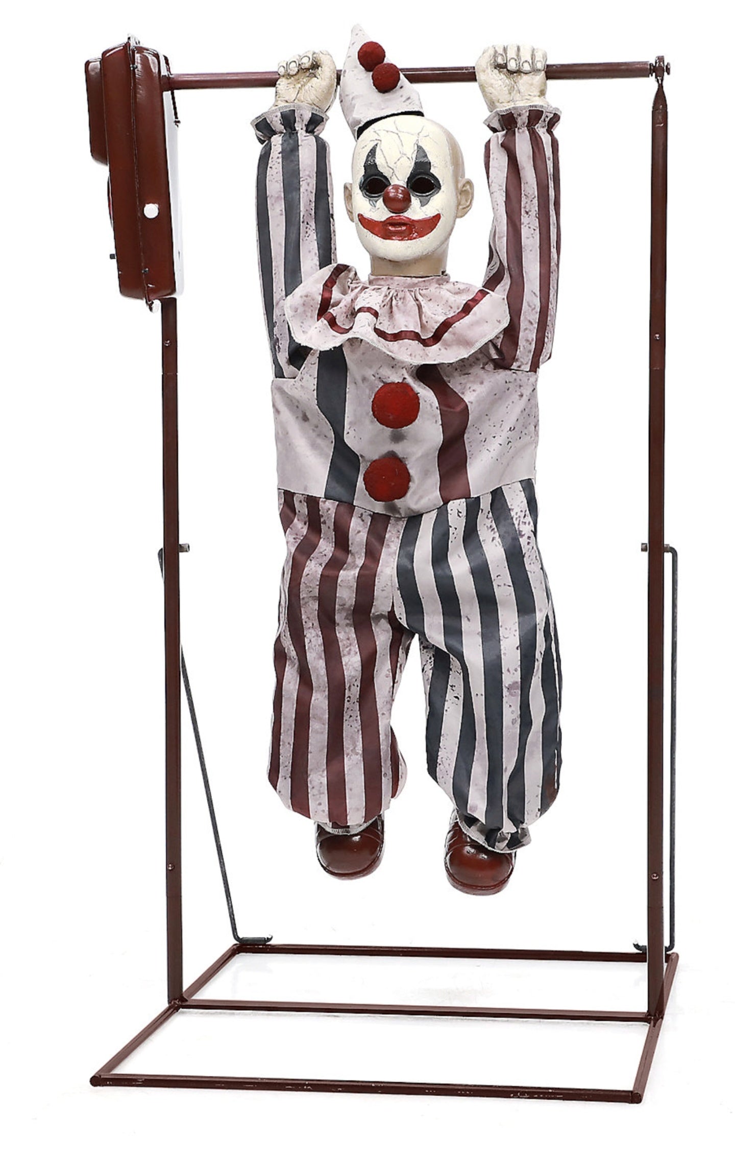 - Step right up and bring the circus to your home! Watch as this 3-foot Tumbling Clown Doll does a party trick for you and your guests. This Tumbling Clown Doll flips over the bar in circles, as creepy circus music plays. Motion sensor activates top bar turning and sounds. Make the Tumbling Clown Doll a unique addition to your Halloween clown or circus collection. Packaging: Box with Color Label Tumbling Clown Doll Instructions