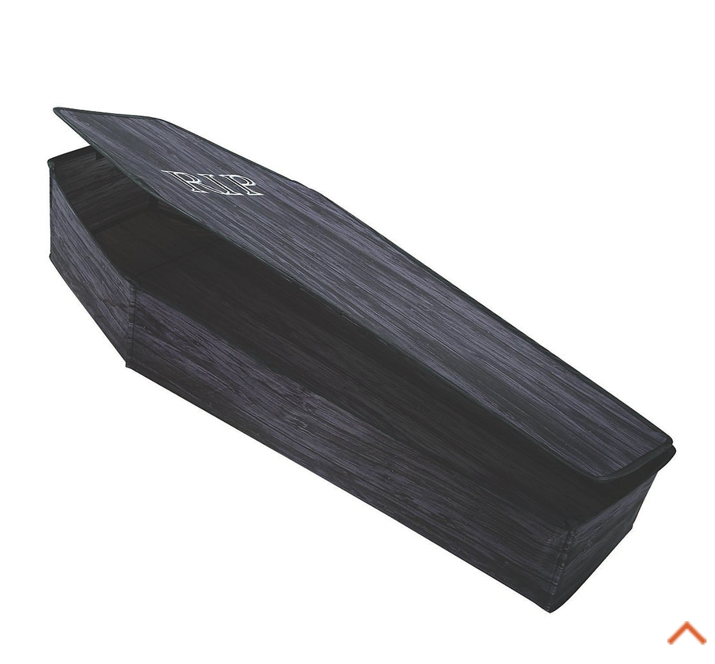 This creepy wood-look black coffin is perfect for visiting vampire guests! The 60-inch realistic-looking black wood planking is printed on weather-resistant polyester material. A black RIP screen-print graphic is on the lid, and the coffin features a flexible spring wire metal frame. Create and maintain the coffin shape by placing the six PVC support tubes into pockets at each of the 6 corners of the coffin. Includes a round zipper bag with handles