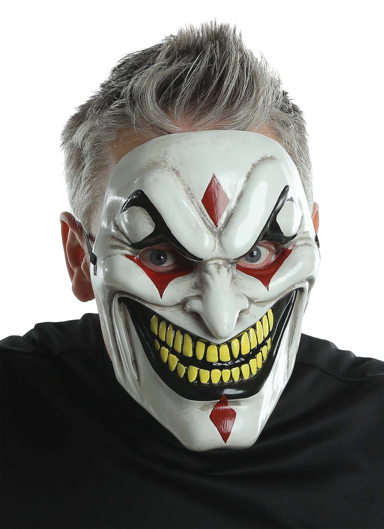 Evil Jester Injection Adult MaskThis wicked clown is sure to scare you! Includes: Heavy duty plastic jester mask with elastic strap foam square at forehead for added comfort. 100% Polypropylene. Available Sizes: One size fits most adults.