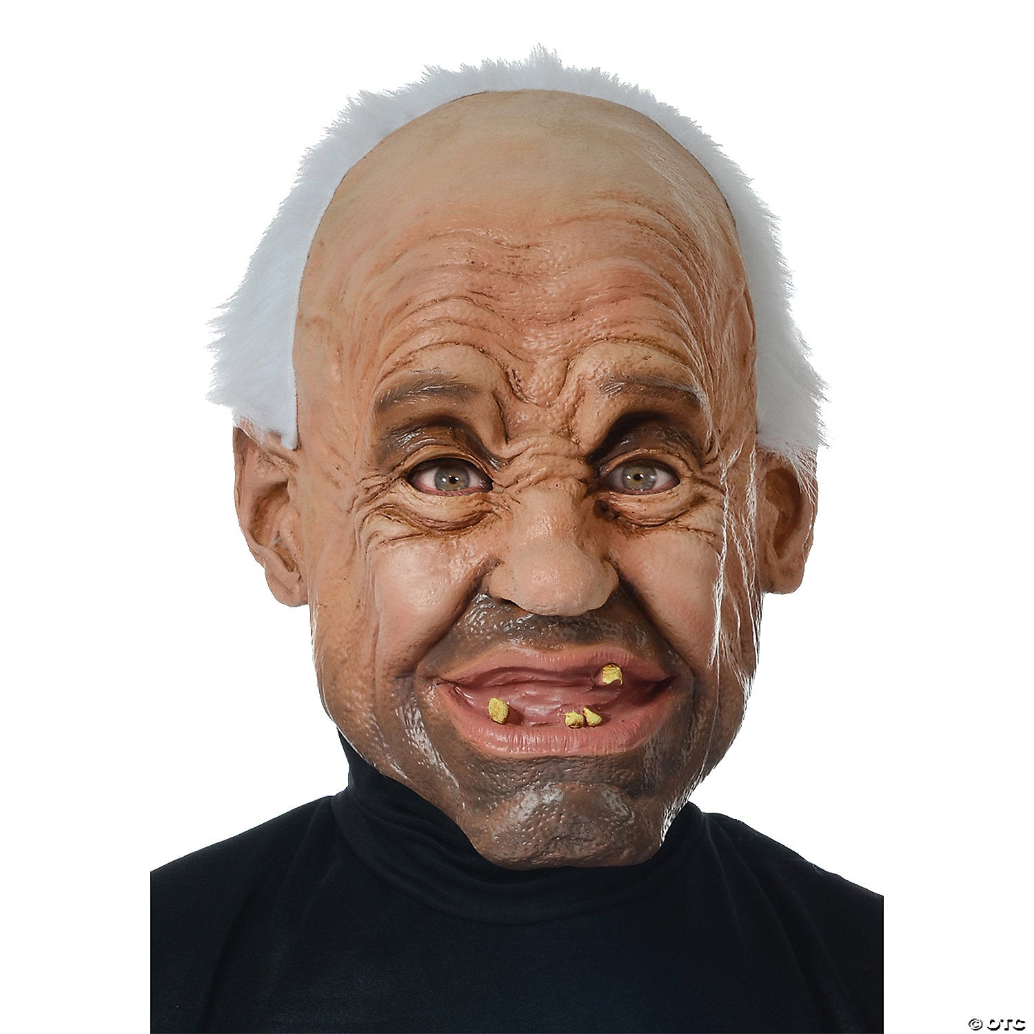 The detailed latex mask features wrinkled skin, furrowed brow, five o ft.clock shadow, receding hairline with white hair and a snaggletooth grin. Latex full-face mask is made from latex and polyester and is held in place by an elastic strap that goes around the back of the head. His silly grin will have everyone laughing. Available Size: One Size fits most Adults.