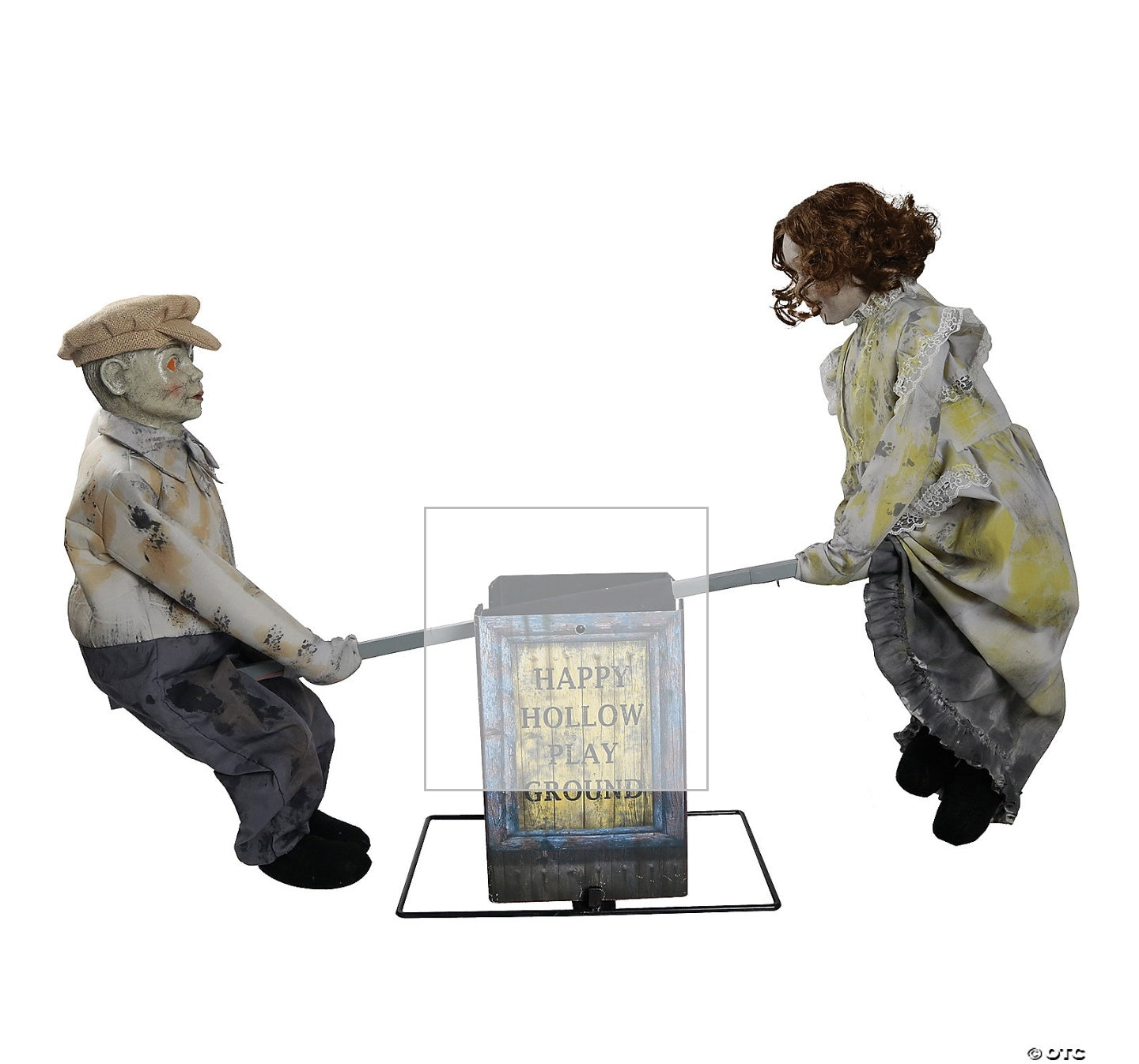 Forgotten and forsaken, these creepydolls are left to see-saw alone for all time. This haunting Animated See Saw Dolls Prop features a Victorian Boy and Girlwith hollowed-out eyes slowly riding on a see-saw while a chilling tune plays! Prop is easy to assemble and will add an unnerving effect to your Halloween decor. Great animated Halloween prop to include inyour haunted house! Activation options: Steady-on, Step-Here Pad, and Infra-Red Sensor (works up to 6.5 feet away and works in all lighting conditions). Standard UL power adapter. Polyester PVC, sponge, plastic, electronics. Assembly required. 36 inchesH x 48 inchesW x 13 inchesD.